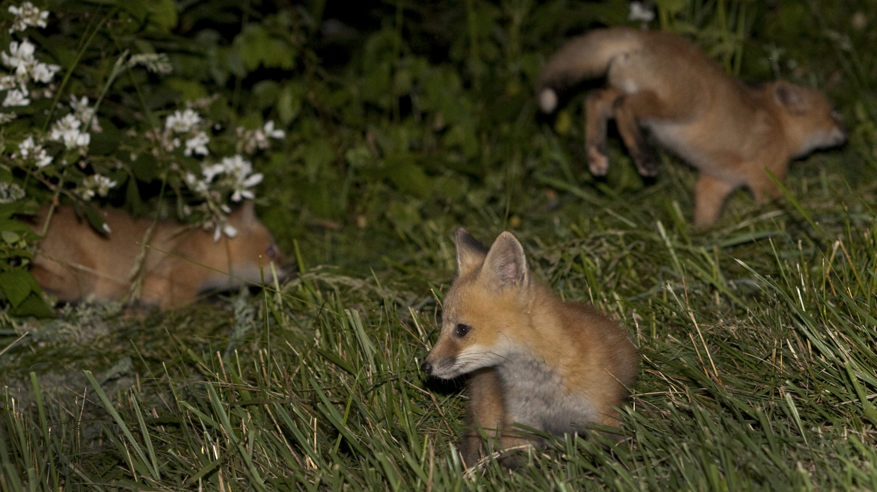 Upon the drive home, I noticed some small creatures in the road.  I was on a less developed part of the parkway and it was really dark, but I was able to pull all the way up before they got scared.  Turns out, it was a small group of young Red Foxes, and after sitting still for a second, they came back out and started playing.  I quickly switched my lens to the 200mm and snapped on my flash, knowing that they might run away at any second.  Fortunately the flash did not scare them, and I was able to get a couple of pictures before they fled.