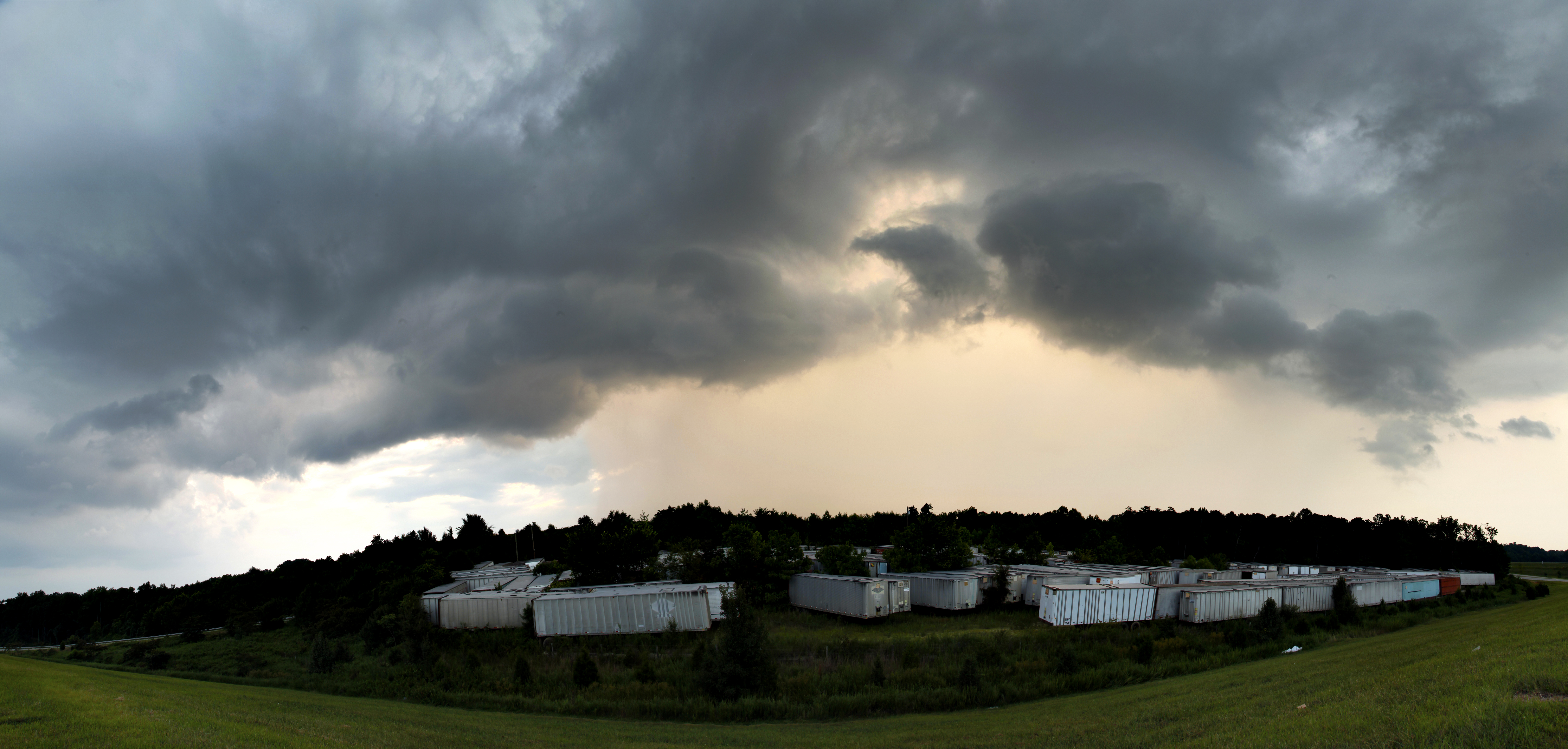 And here is a 12 image panorama of the storm rolling in across a semi-truck graveyard south of Greensboro NC