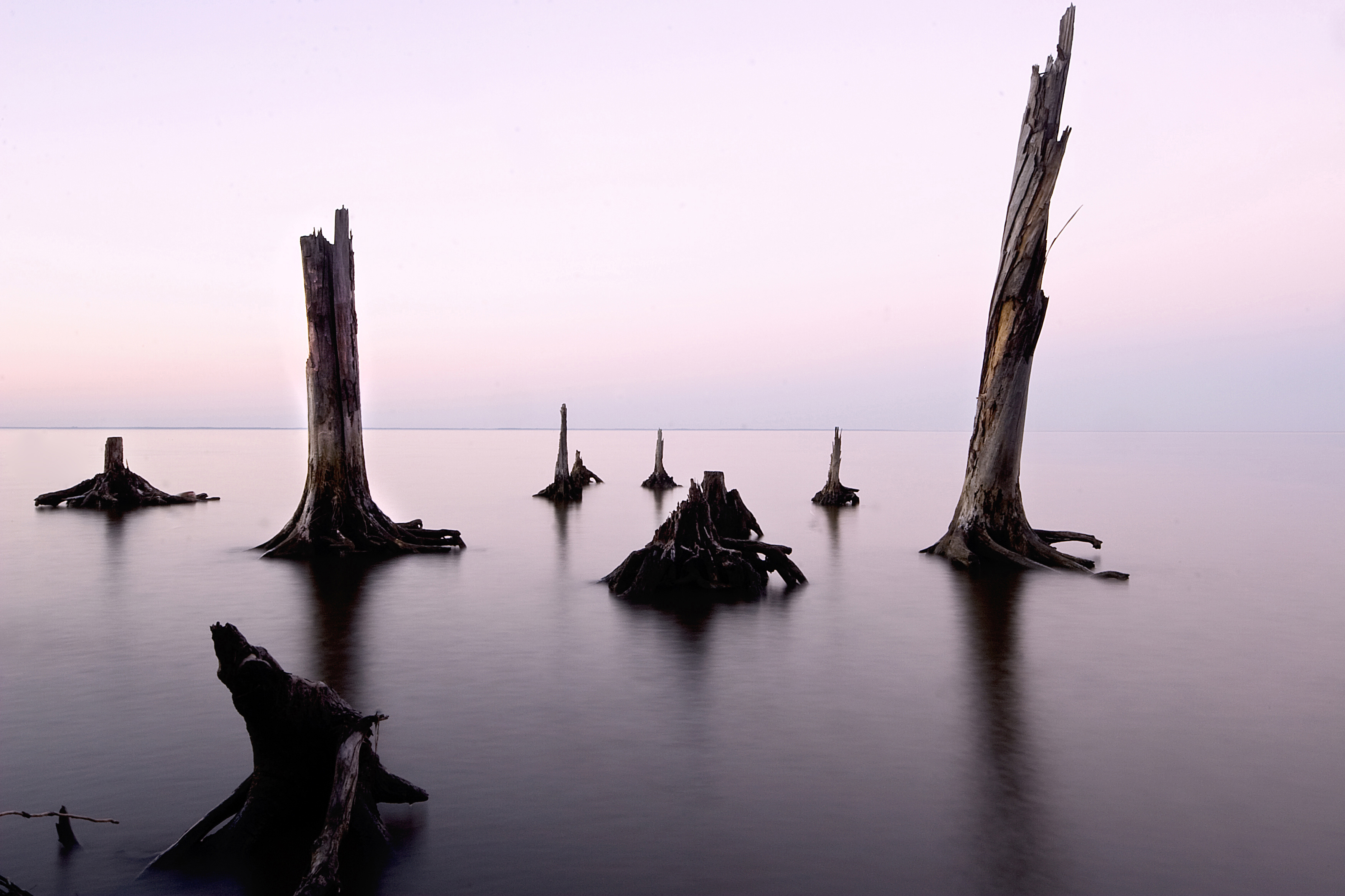 This first shot is from the Outer Banks. The salt water kills the tree over the years and will eventually turn it into tough dead wood which will stand until the waves eventually take it down after many years.