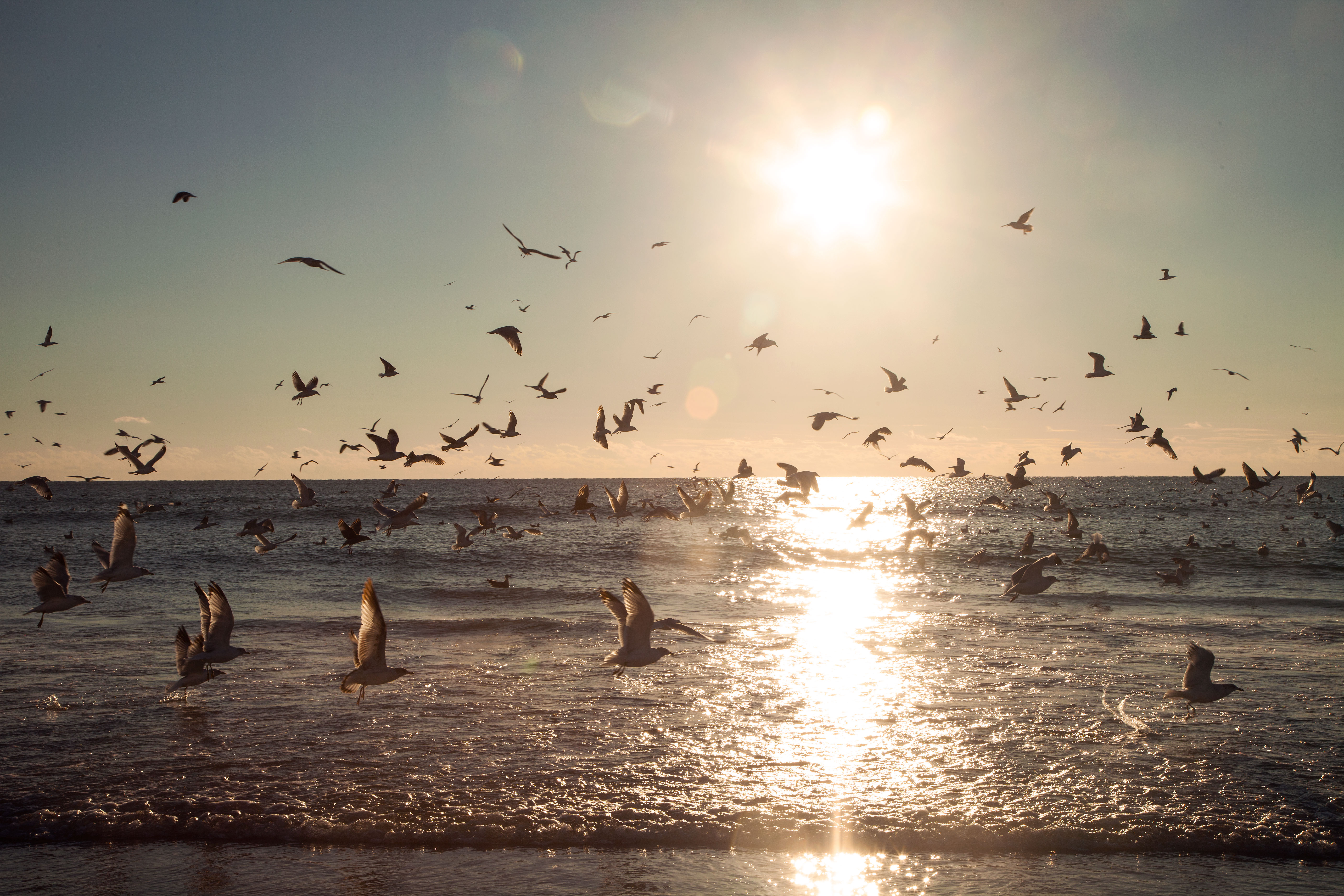 When I stepped on the beach for sunrise, there weren’t any clouds or wildlife, and it was a relatively dull scene.  This changed about a half hour after sunrise when altocumulus clouds started moving in from my south.  They are my favorite type of cloud (besides wall clouds) and they looked amazing over the ocean!  It was then when I noticed a huge flock of seagulls and pelicans down the beach flying around and catching fish.