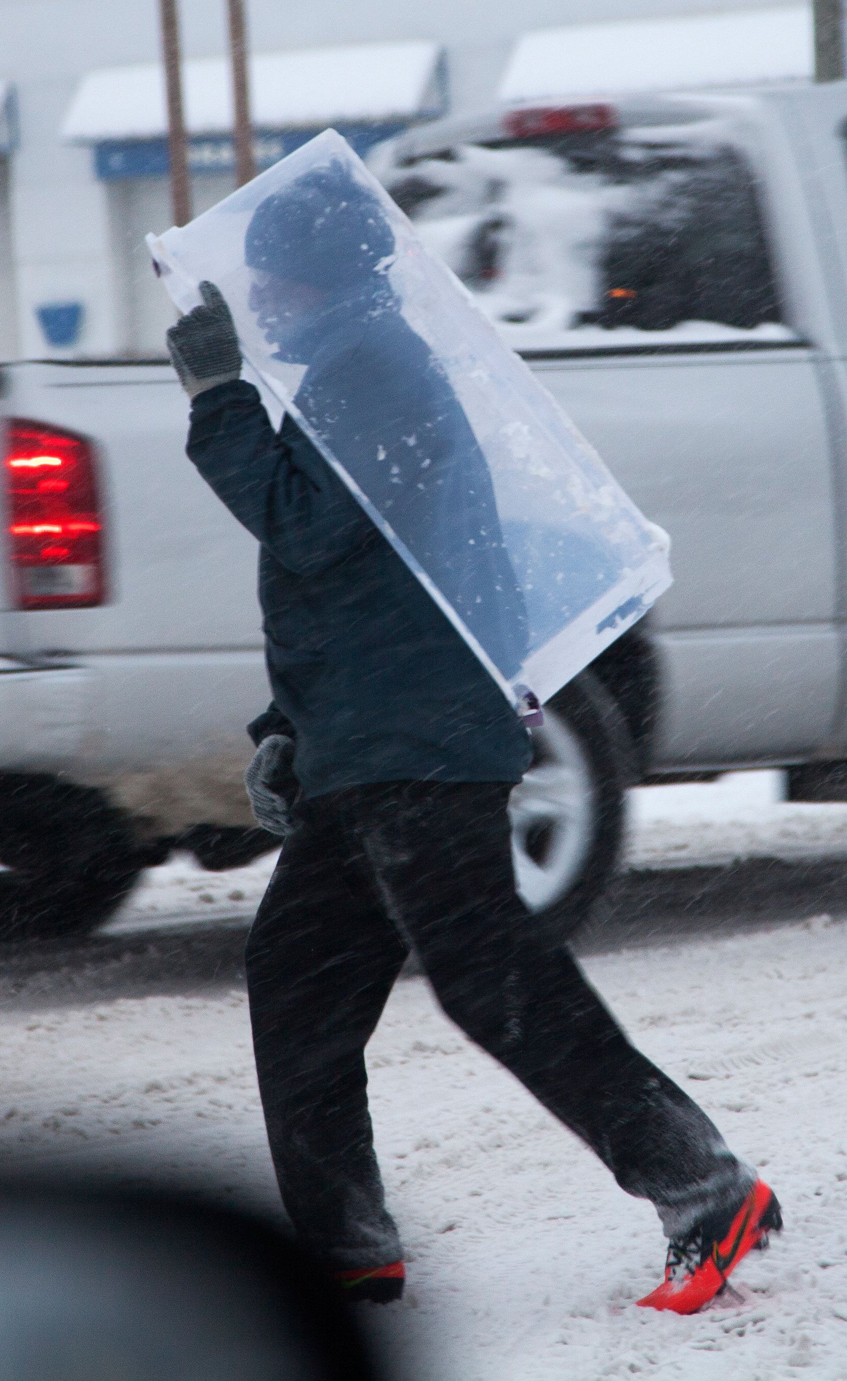 And finally, I found someone with some real genius! I saw this guy walking and I had to get a picture. He had on cleats for traction in the snow, and the plastic box keeps the snow off of his head but can also double as a sled!