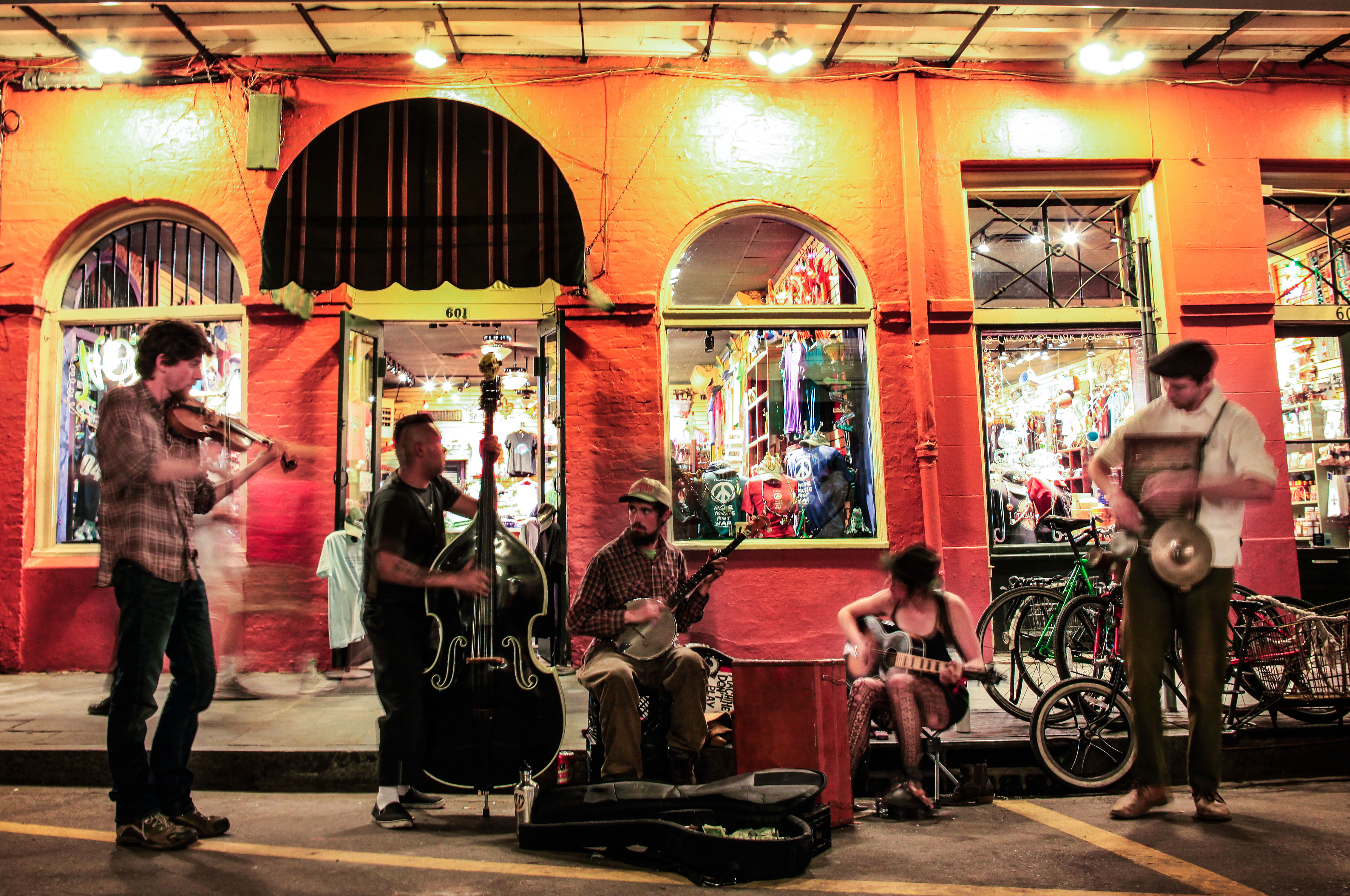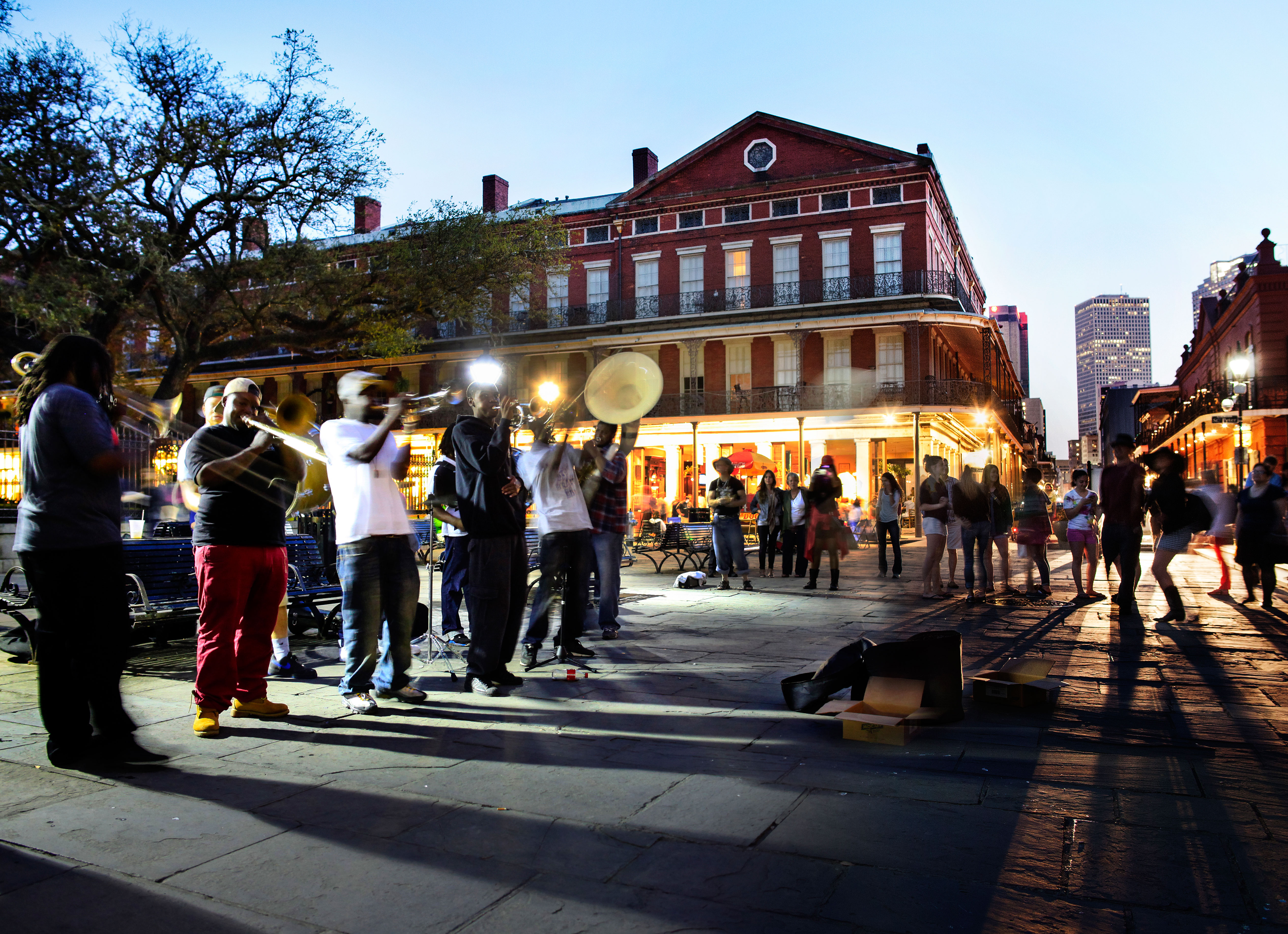 This picture is a long exposure of a street performing group that was playing upbeat New Orleans style jazz/funk.