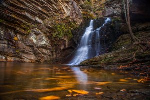Autumn leaf swirls and sunset light at Lower Cascade Falls, part of Hanging Rock State Park in NC. A five second long exposure captured early November 2016.