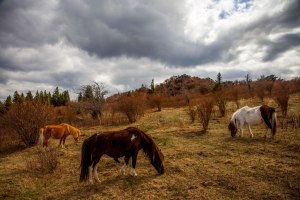 The wild ponies of Grayson Highlands graze on a grassy bald as a storm approaches, at Grayson Highlands State Park, April 2017