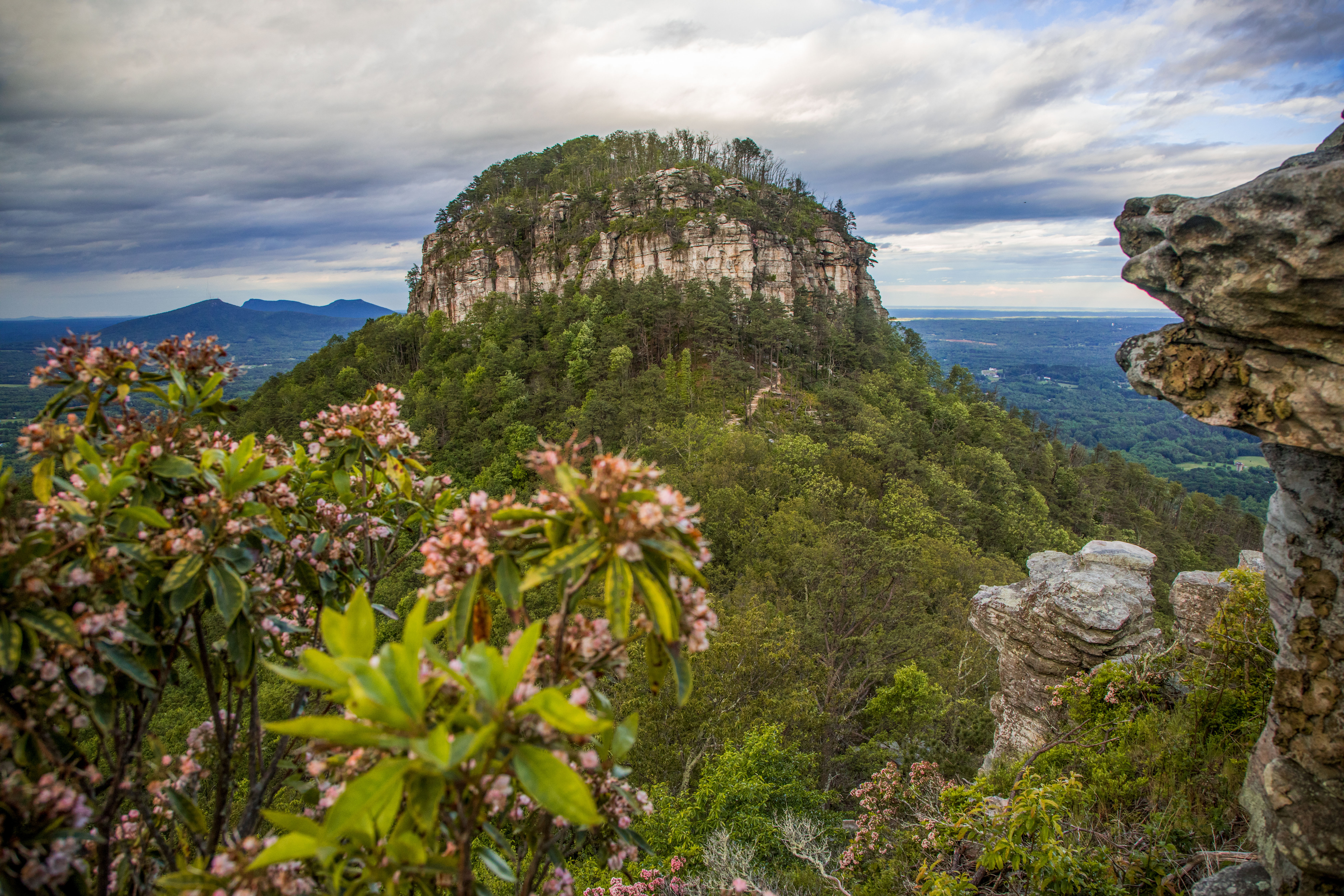 Mountain Laurel in front of Pilot Mountain and the remaining Sauratown Mountains, at Pilot Mountain, North Carolina. Captured late May 2017.