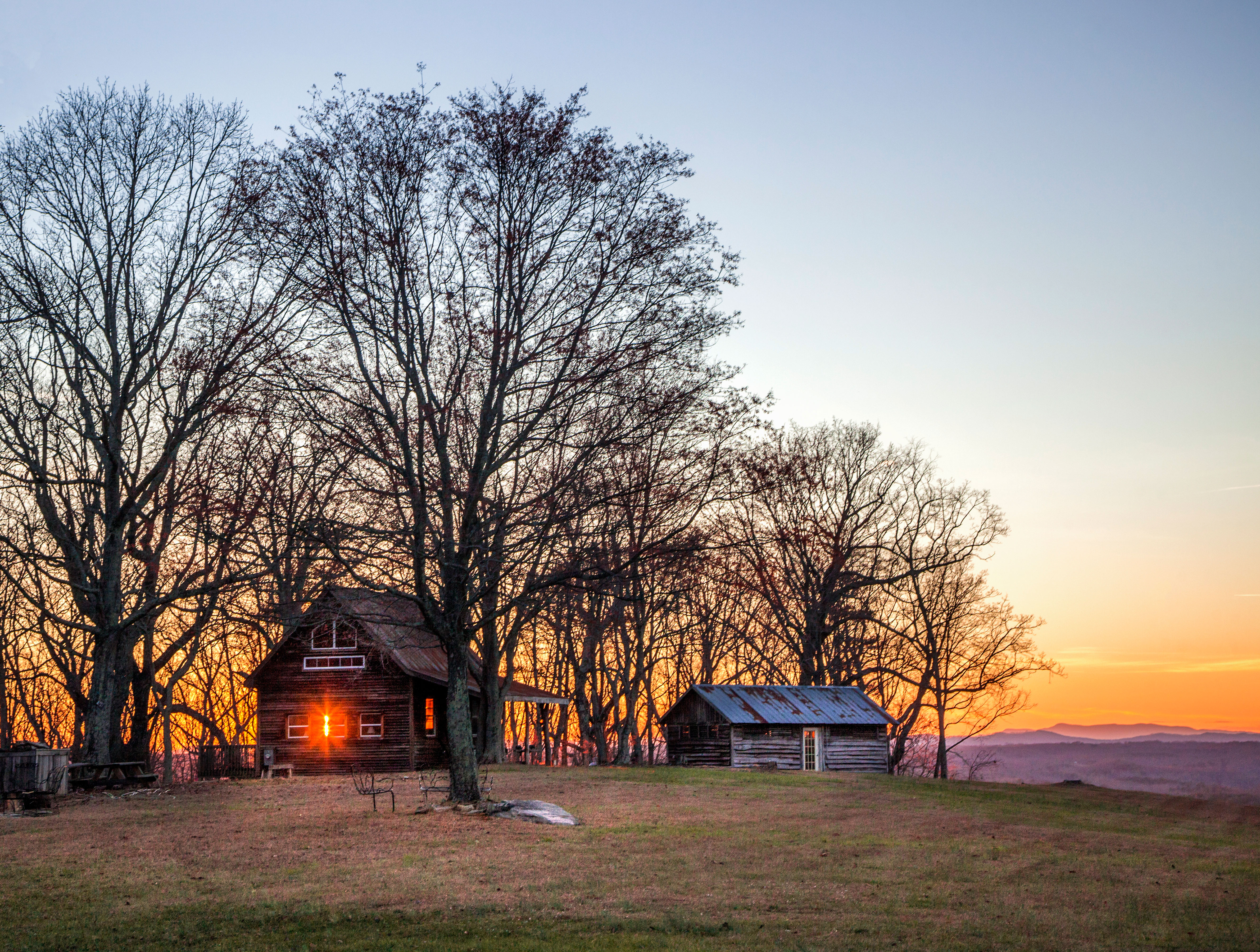 Sunstar and a couple of older cabins along a ridge north of Hanging Rock. Overlooking the Blue Ridge Mountains, at Singletree Gun & Plough. Captured March 19, 2017.
