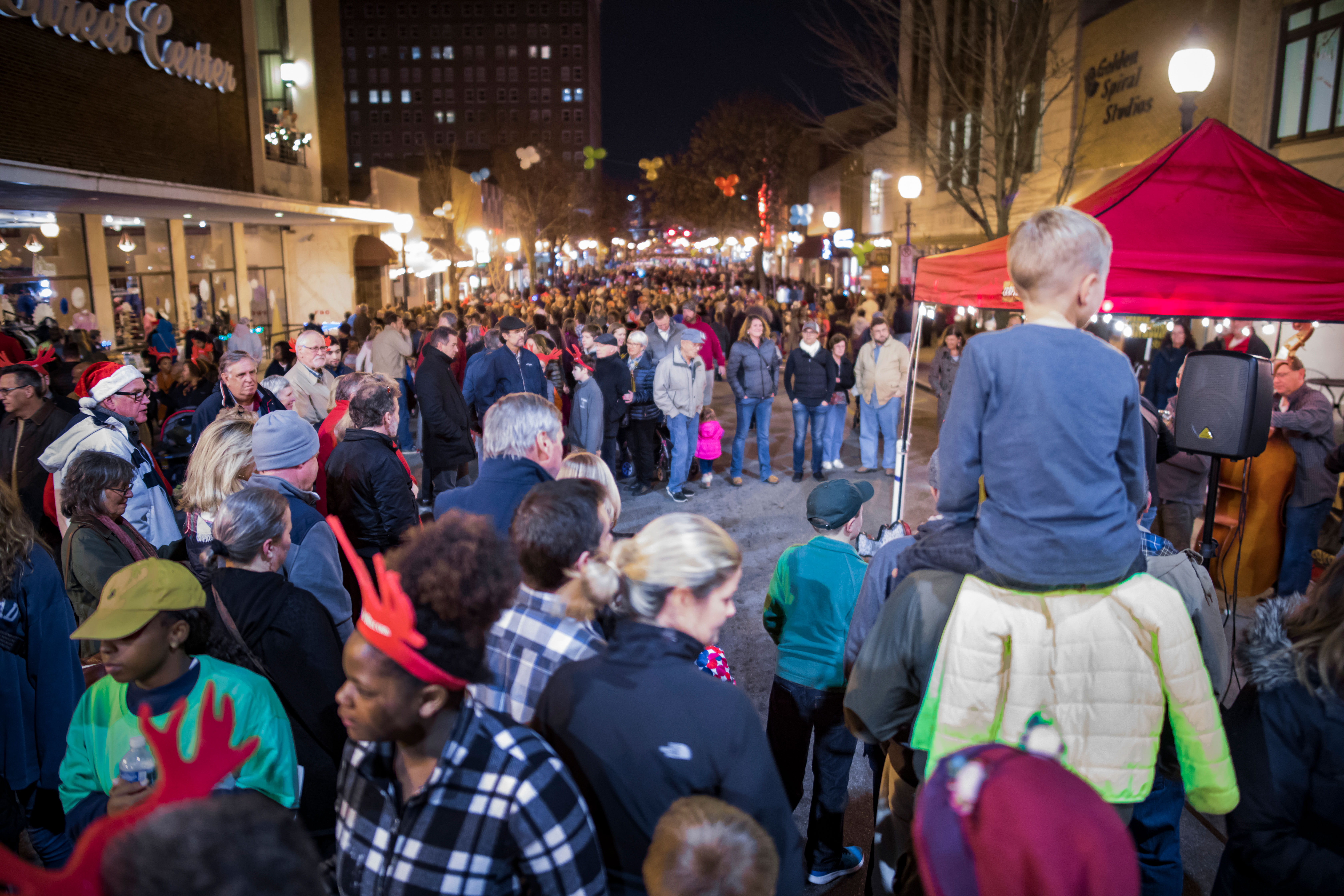 Crowds gather to listen to one of the many musical performances along the street in downtown Greensboro, part of the Festival of Lights. December 2, 2017