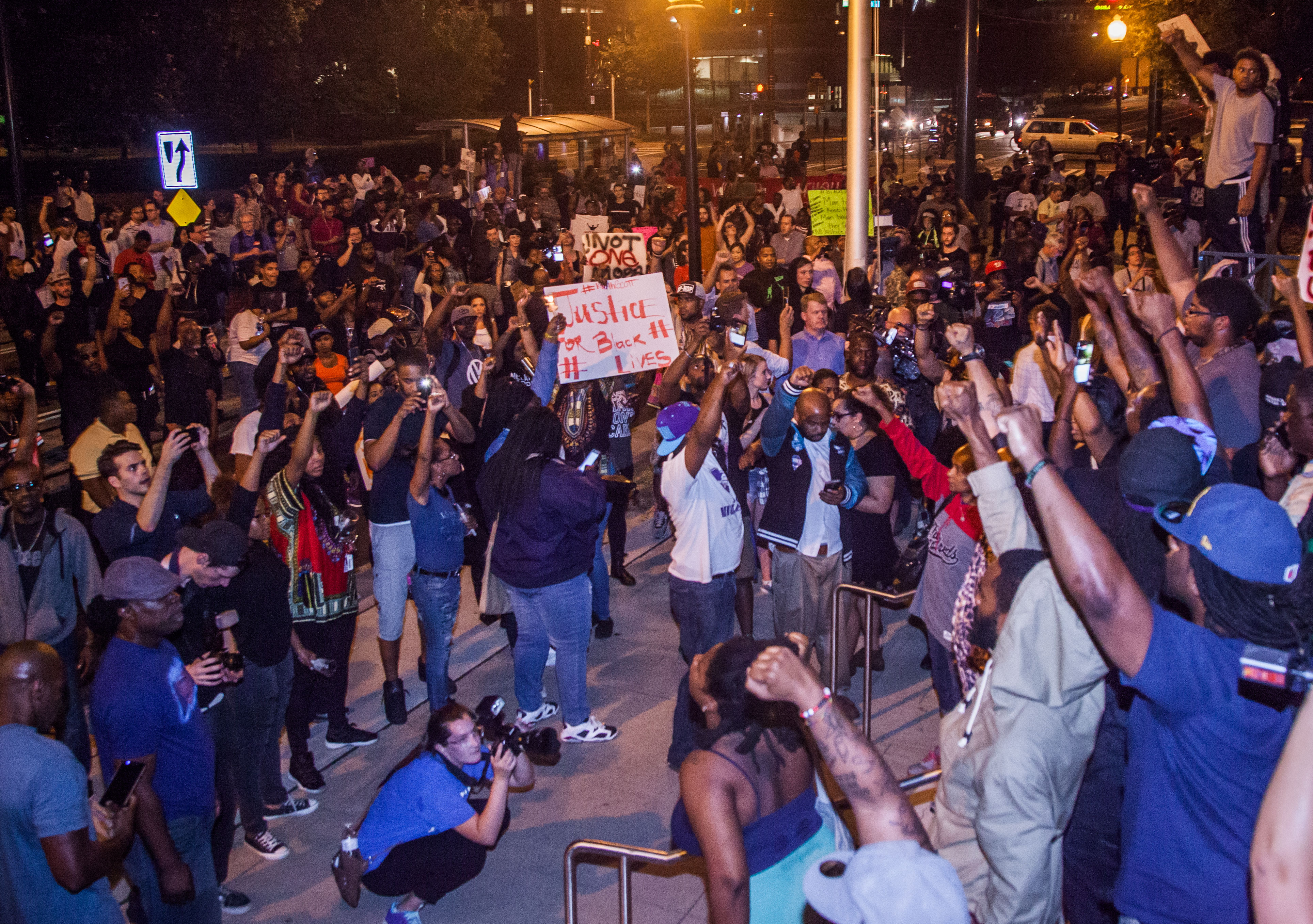 The protest on the steps of the Charlotte Police headquarters. Riot squad team assembles near the beginning of the protest. Still peaceful at this point in the night. 9/21/16