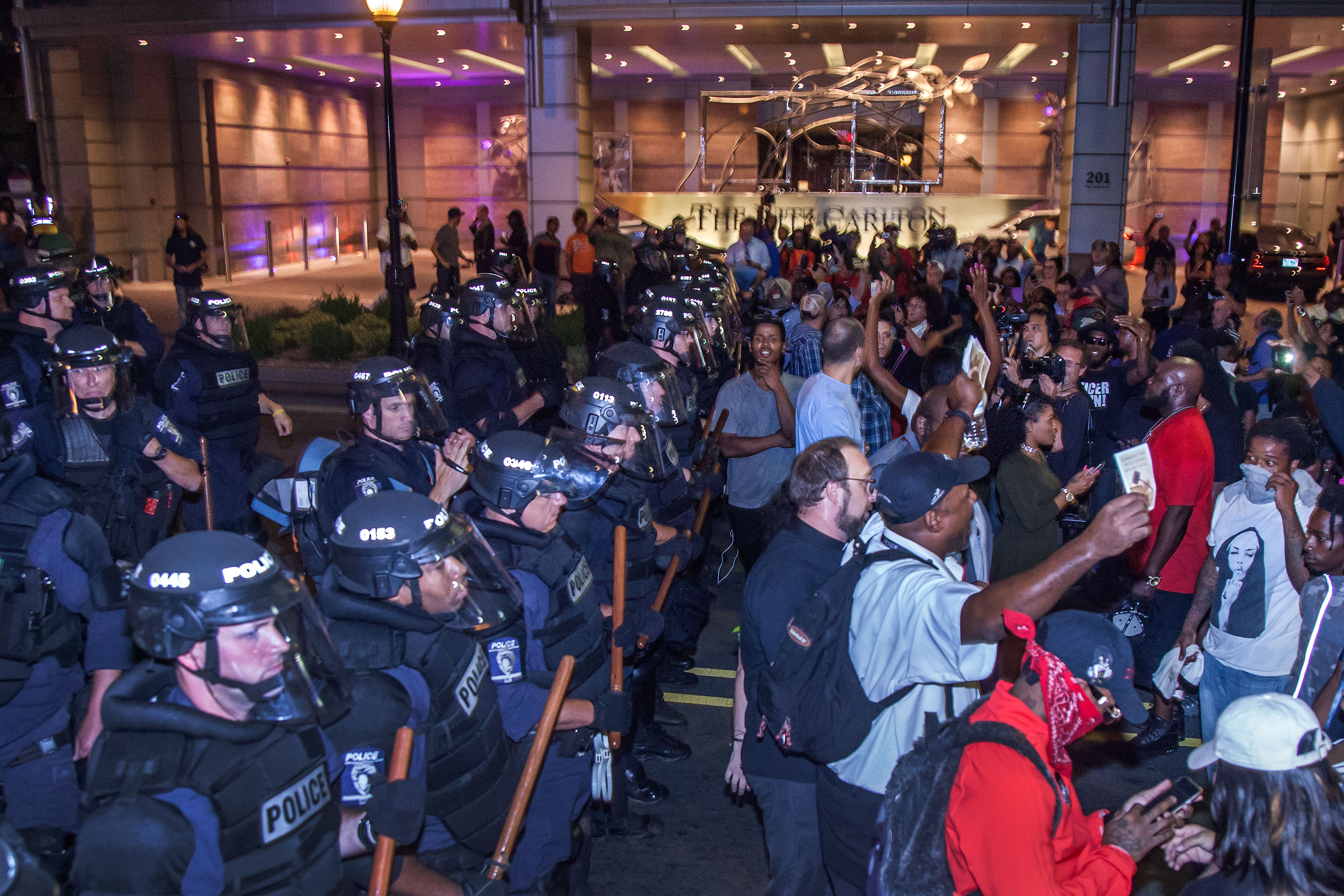 Riot Squad Line, Charlotte Protest Posted on September 24, 2016September 24, 2016 by Exploring NC Front line of the riot squad while the event was still peaceful. Uptown Charlotte, NC 9/21/16