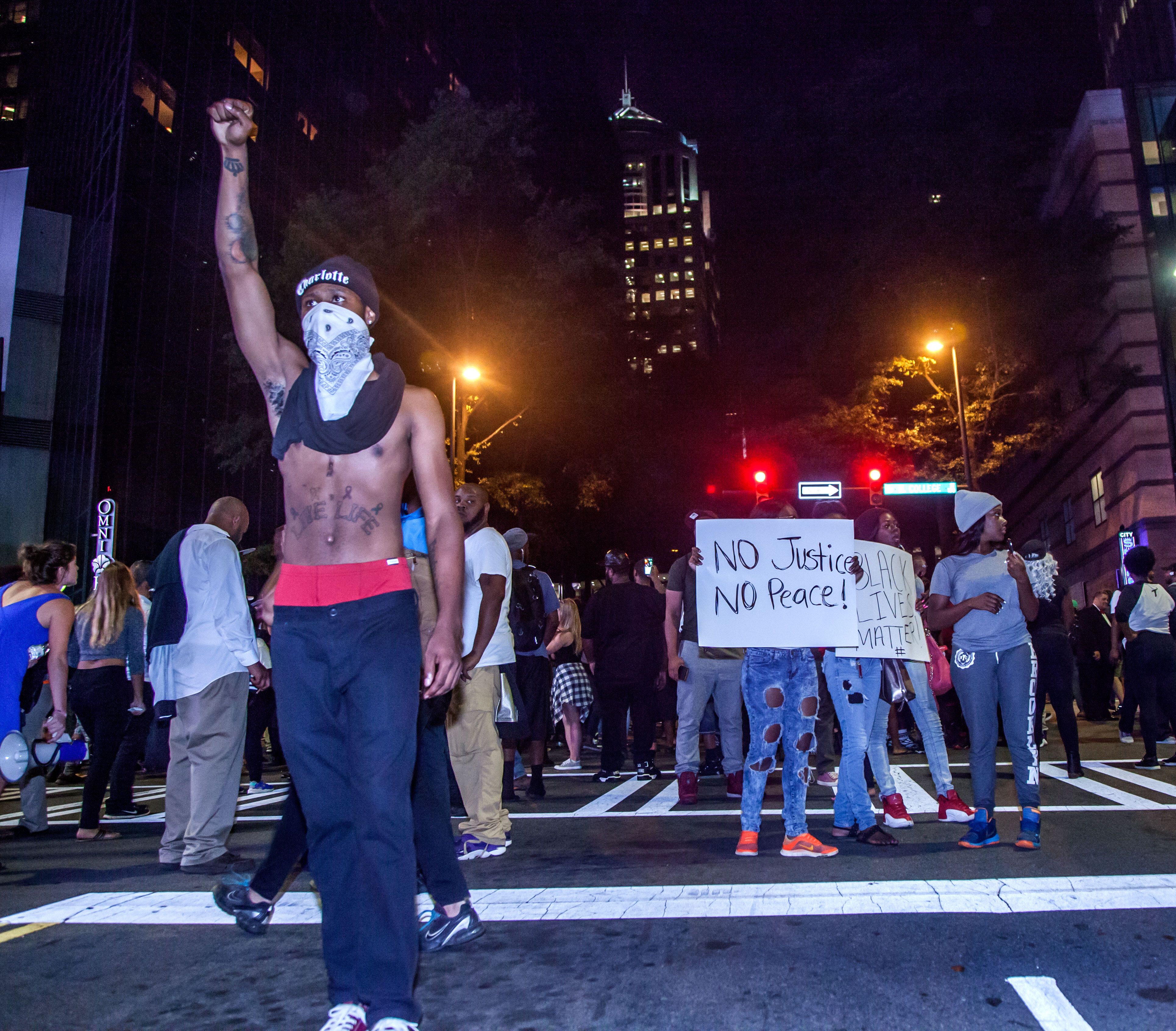 Stand Tall, Charlotte Protest Posted on September 24, 2016September 24, 2016 by Exploring NC A protester stands tall with fist raised as the tension of the riot grows. Uptown Charlotte, NC 9/21/16