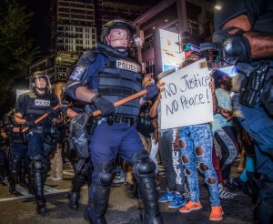 No Justice, No Peace. Charlotte Protest Posted on September 24, 2016September 24, 2016 by Exploring NC The riot squad walks by a group of protesters, while avoiding all eye contact. Uptown Charlotte, NC 9/21/16