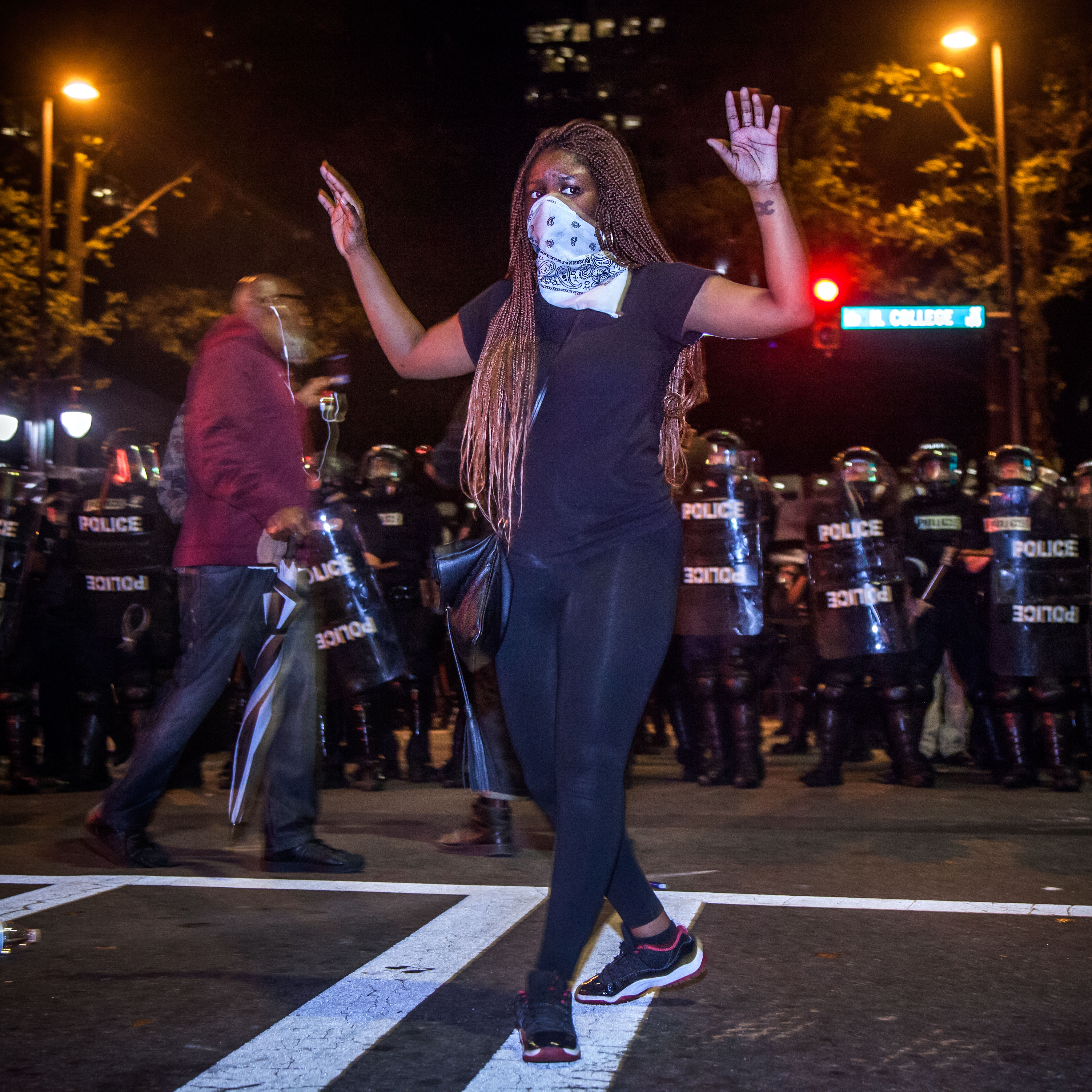 A protester silently walks with her hands in the air. “Hands Up, Don’t Shoot” could be heard chanted by the protesters throughout the night. Uptown Charlotte, NC 9/21/16